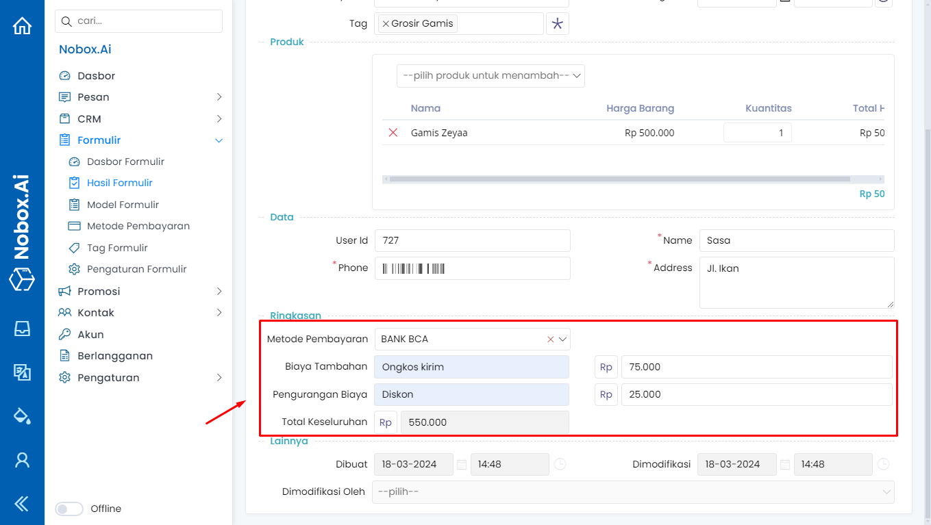 - Pada bagian Ringkasan, Isi penambahan biaya, contoh untuk penambahan biaya diisi ongkir dengan nominal 75.000