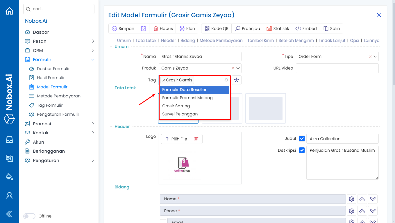 Tag Formulir juga dapat Anda gunakan pada menu [Model Formulir], dengan cara :