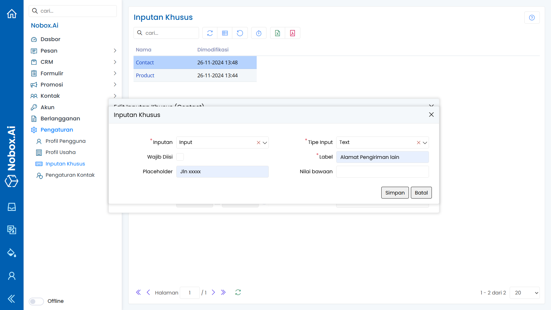 Inputan Khusus adalah salah satu menu pada Nobox.Ai yang memungkinkan Anda untuk menambahkan kolom khusus sesuai dengan kebutuhan Anda.
