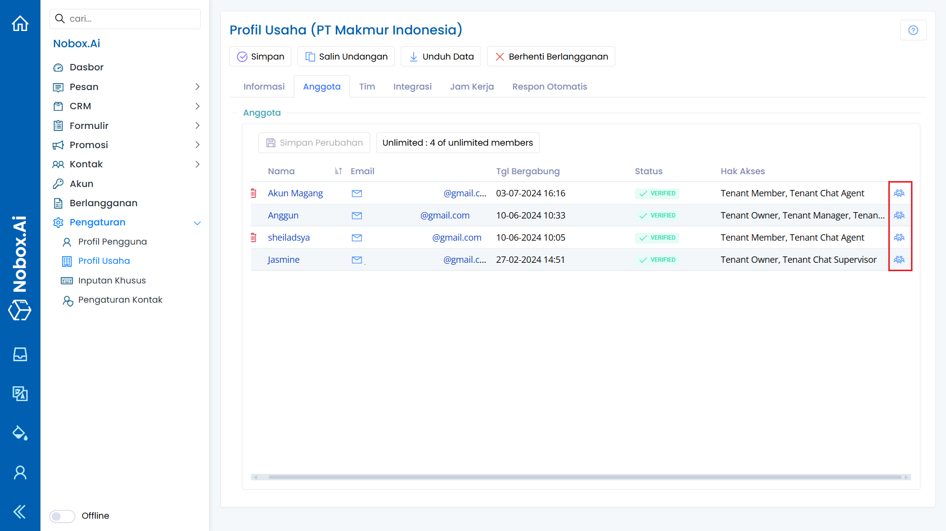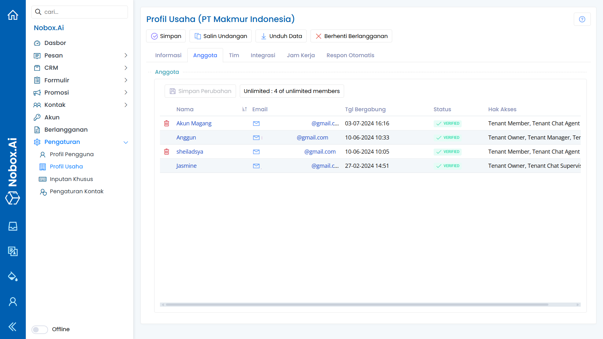 | Member | Level user dengan hak akses sebagai anggota tenant yang memiliki semua akses fitur Nobox.Ai kecuali akses manajemen akun dan pengaturan profil usaha. |
