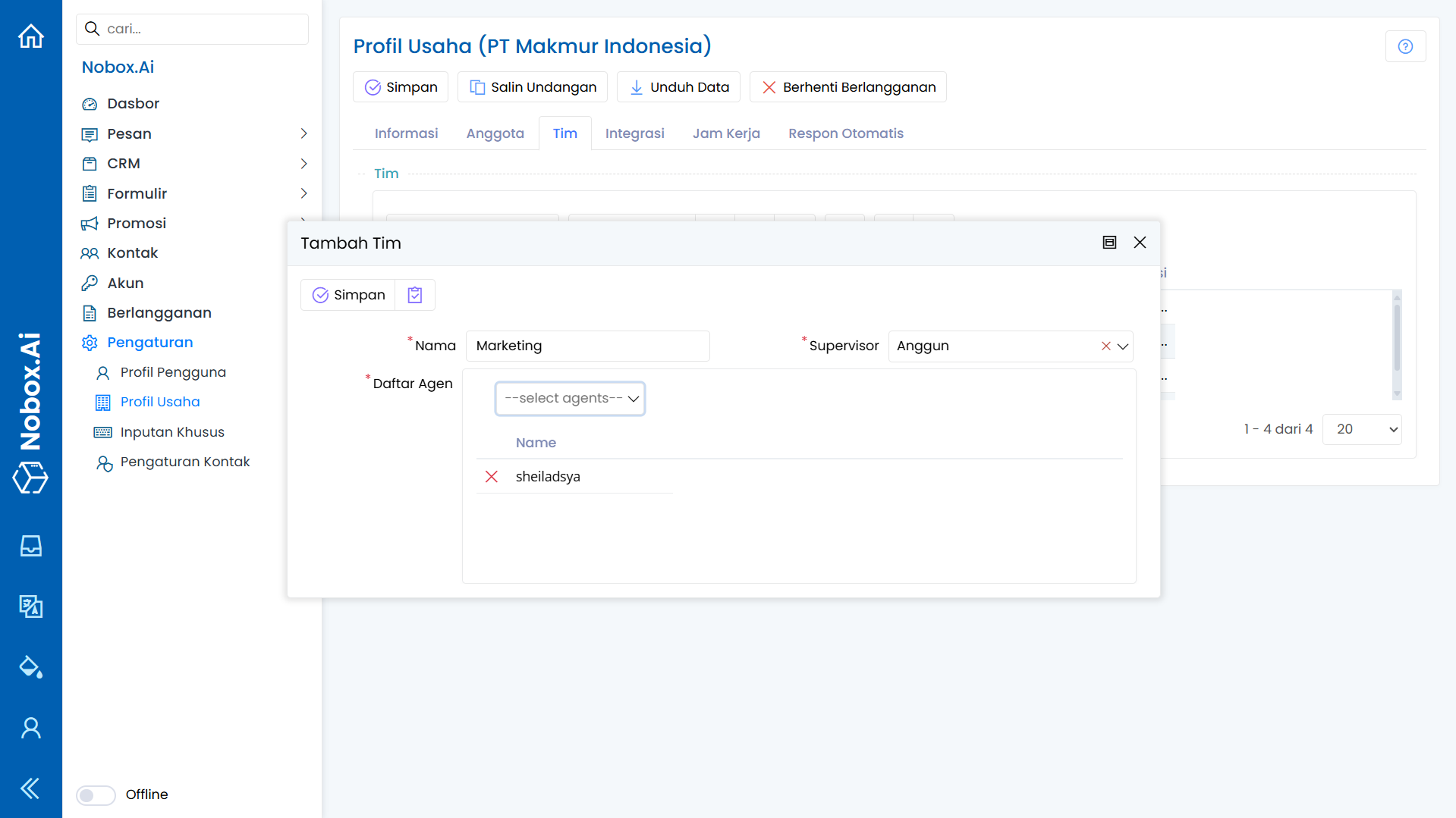 Tim adalah salah satu fitur Nobox.Ai yang digunakan untuk mengelompokkan agen berdasarkan tim yang ada pada perusahaan Anda.