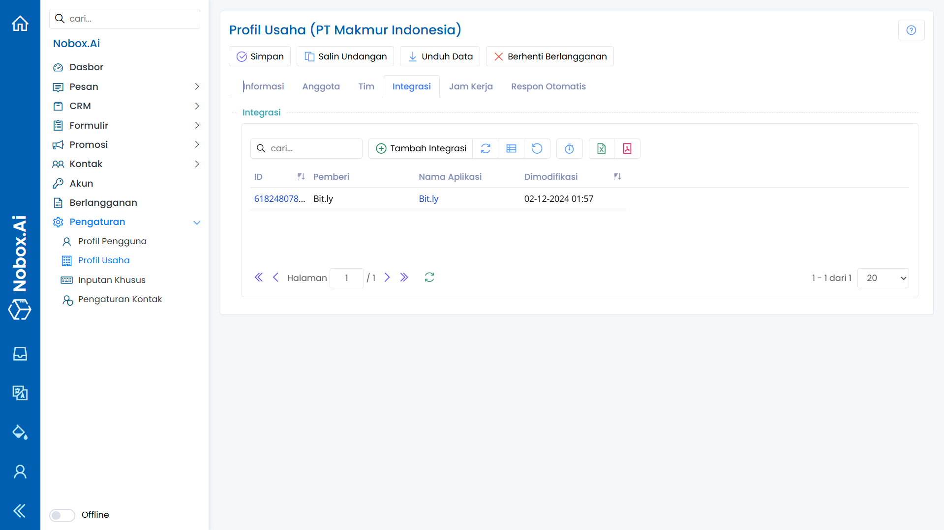 Integrasi adalah salah satu fitur Nobox.Ai yang digunakan untuk menghubungkan aplikasi pihak ke tiga dengan Nobox.Ai.