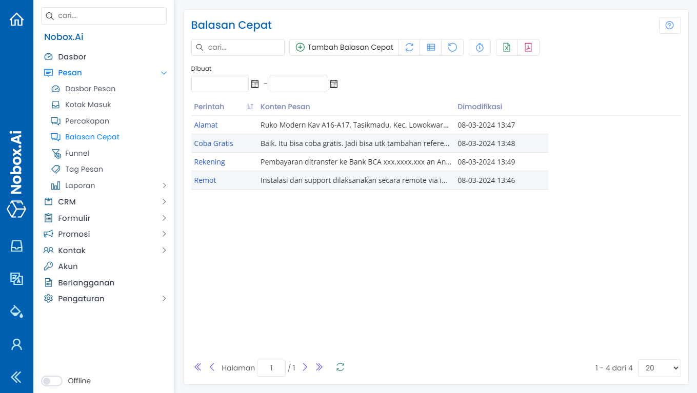 Balasan Cepat adalah salah satu menu pada Nobox.Ai yang digunakan untuk template pesan agar dapat membalas pesan lebih cepat berupa pesan teks atau media seperti gambar, GIF dan Video.