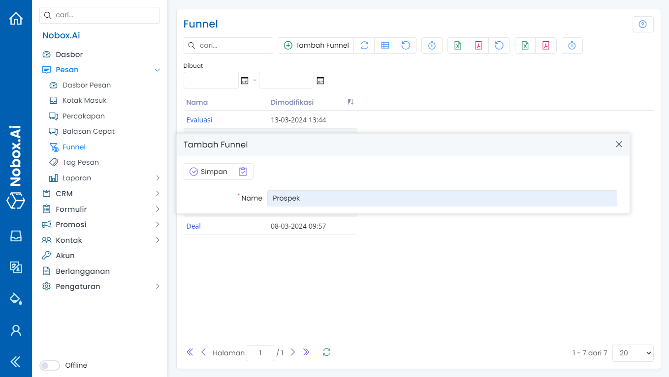 Funnel adalah salah menu pada Nobox.Ai yang digunakan untuk mengkategorikan tahapan proses pemasaran dan support.