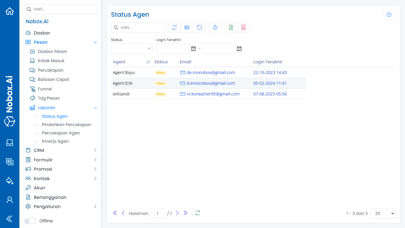 Pada salah satu submenu Nobox.Ai ini berisi informasi siapa saja agen yang mengubah statusnya menjadi online maupun offline. Serta informasi kapan terakhir kali agen login.
