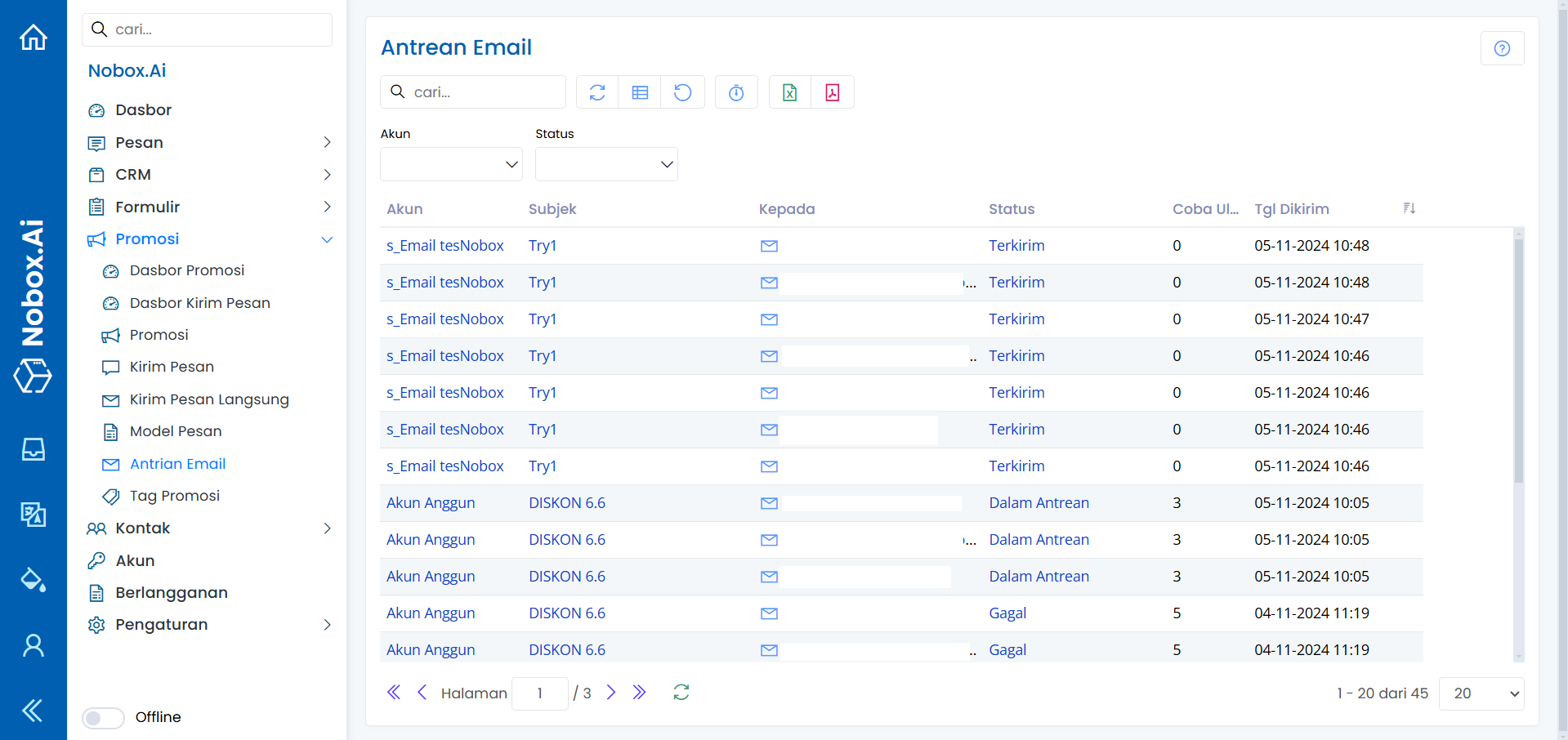 Antrian Email adalah salah satu menu pada Nobox.Ai yang digunakan untuk monitoring antrian email. Jadi Anda dapat mengetahui hasil kirim pesan yang masih dalam antrian, gagal dan sudah terkirim.