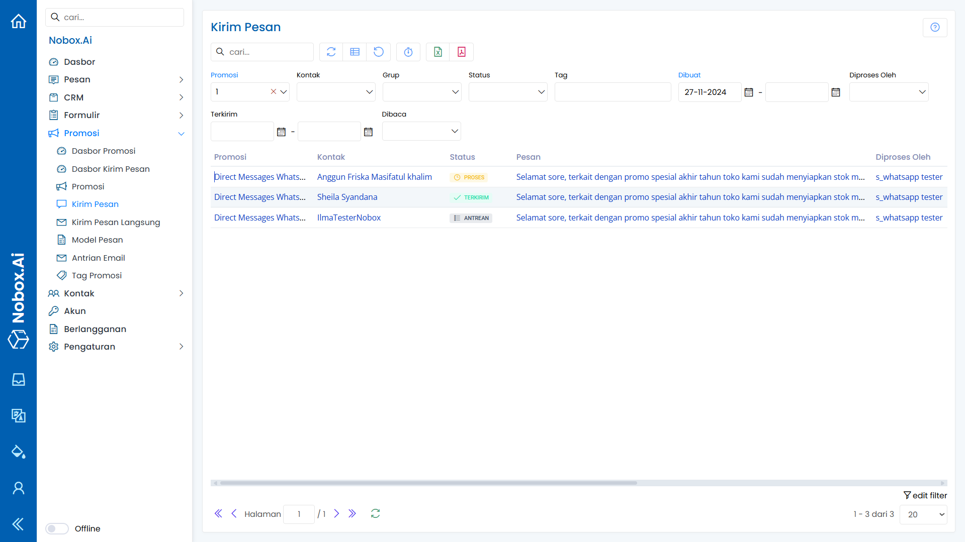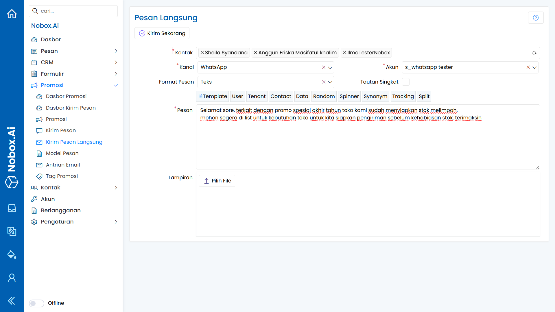 Kirim Pesan Langsung adalah salah satu menu pada Nobox.Ai yang digunakan untuk mengirim pesan secara langsung ke salah satu kontak atau beberapa kontak.