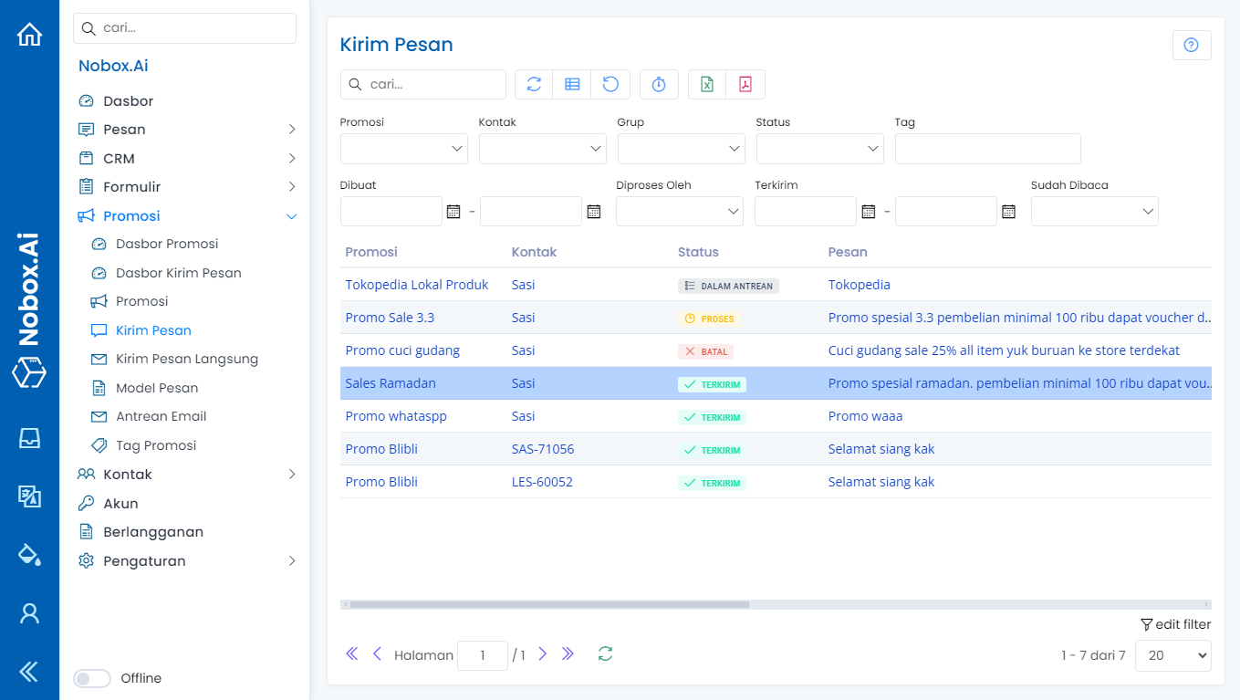 Kirim Pesan adalah salah satu menu pada Nobox.Ai yang digunakan untuk monitoring hasil kirim pesan dari semua data promosi. Jadi Anda dapat mengetahui hasil kirim pesan yang masih dalam antrian, proses, gagal dan sudah terkirim.